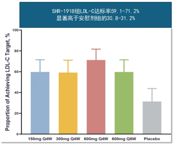 与安慰剂组相比,SHR-1918 各剂量组的LDL-C水平显著降低,TG水平也呈现相似趋势。与安慰剂组相比,接受 SHR-1918 治疗的患者在 LDL-C 达标率方面表现更佳。