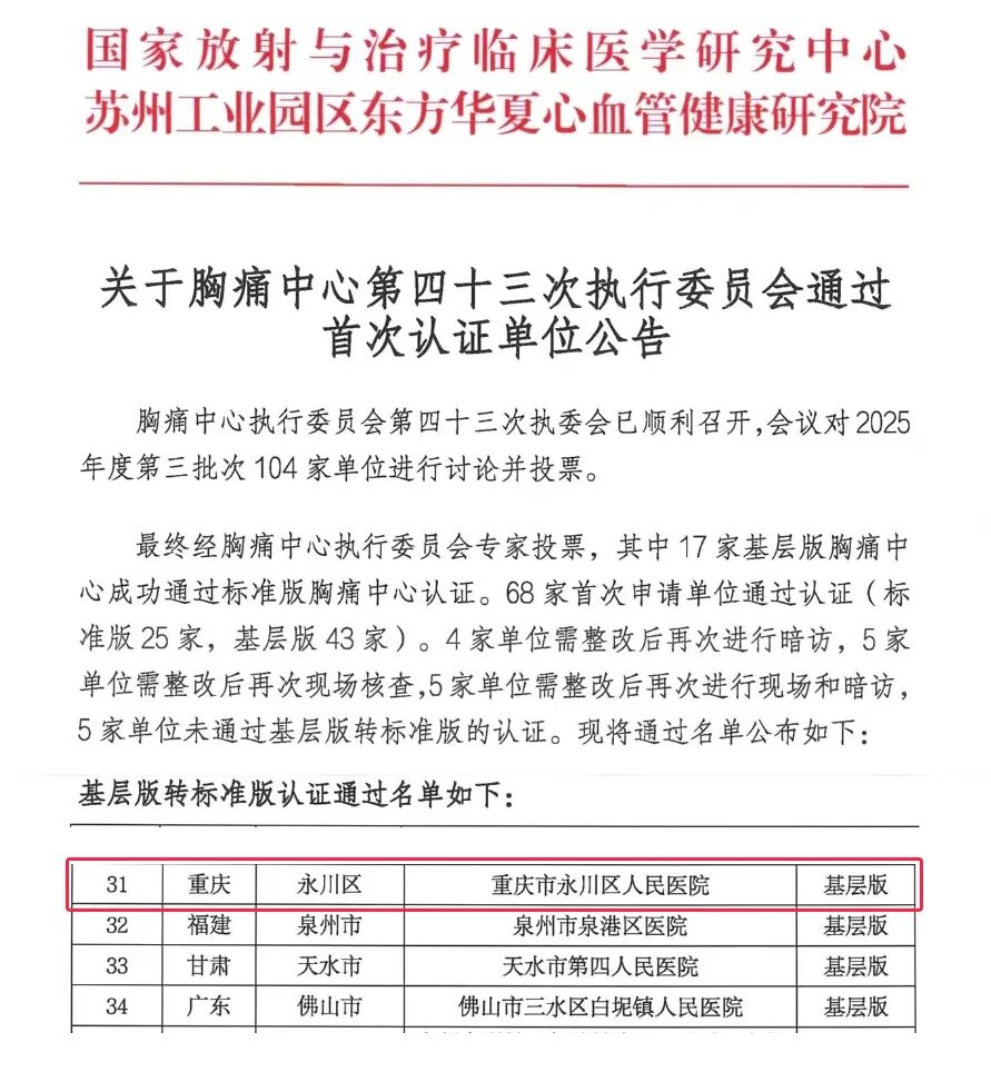 会员之窗 | 喜报!重庆市永川区人民医院喜获“国字号”认证,胸痛救治迈入国家级标准