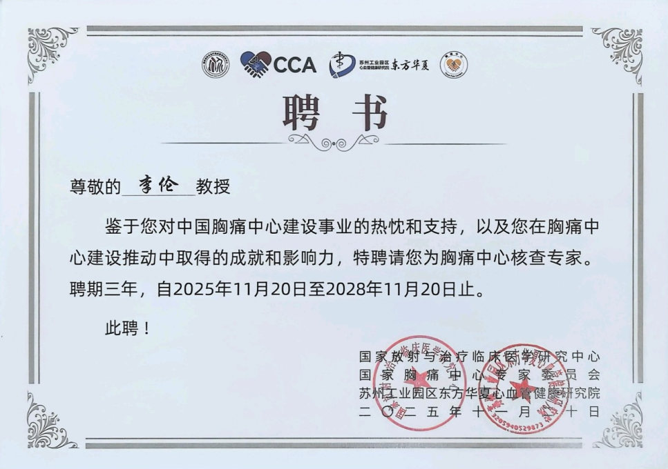 11月20 日,心血管内科主任、胸痛中心医疗总监李伦凭借在胸痛中心建设与质量控制方面的突出贡献,被国家胸痛中心专家委员会正式聘为国家级胸痛中心核查专家。这是对李伦个人专业能力的高度认可,也反映出医院胸痛中心人才培养工作得到国家层面的充分认可。