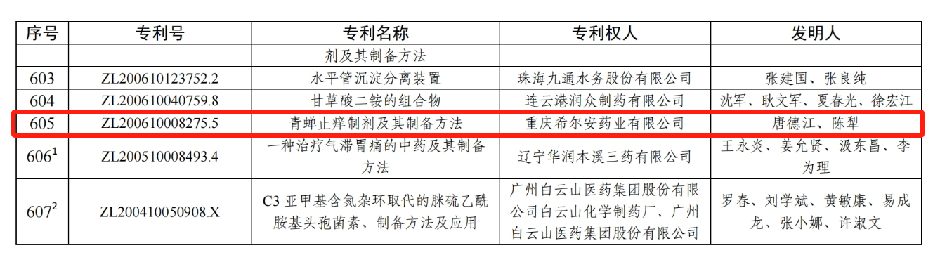 2025年6月5日,国家知识产权局公布了第二十五届中国专利奖评审结果,重庆希尔安药业有限公司凭借专利中国发明专利 “ZL200610008275.5 青蝉止痒制剂及其制备方法”,荣获中国专利奖优秀奖。这一荣誉不仅是对希尔安药业在科技创新和知识产权保护方面的高度认可,更是公司发展历程中的又一重要里程碑。