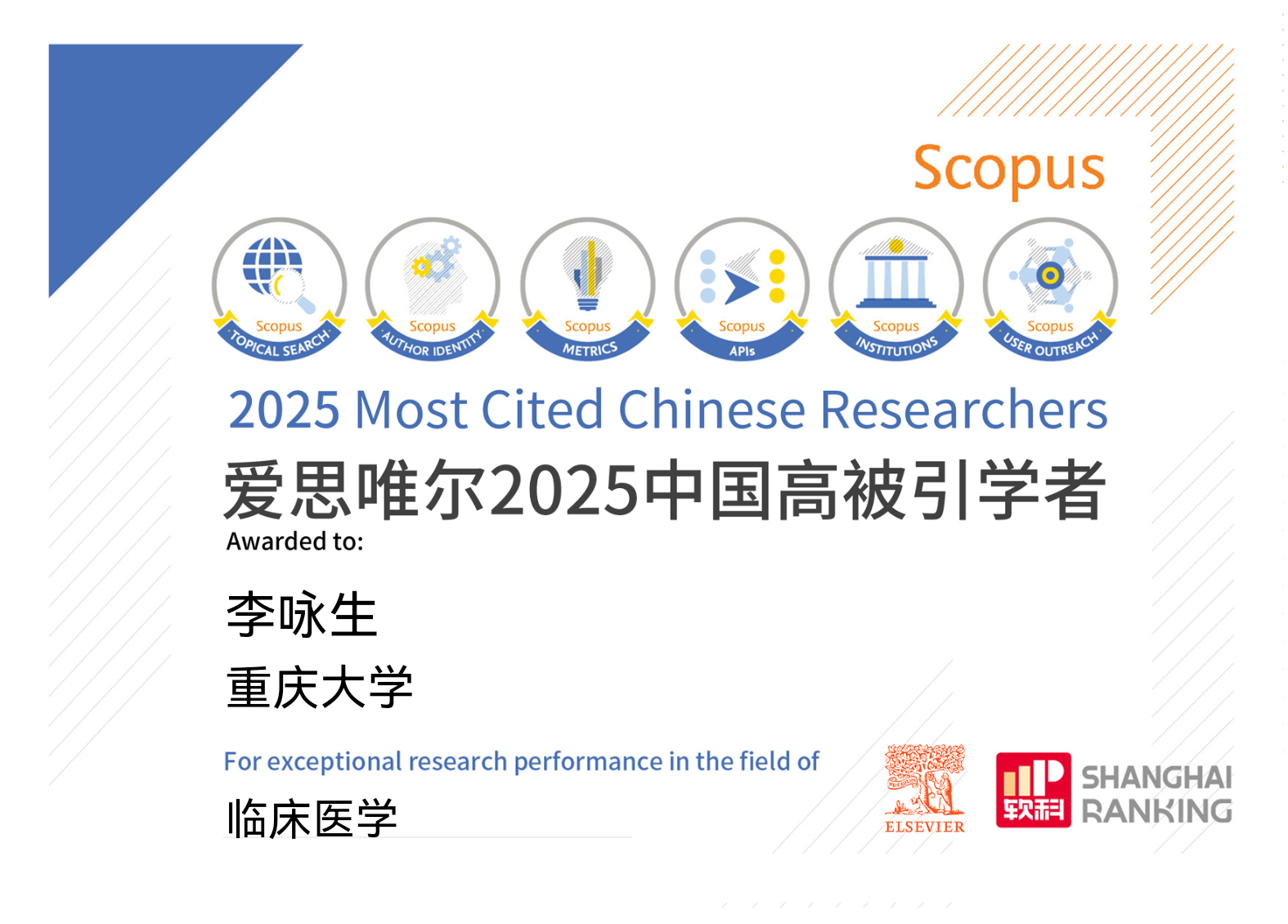 “中国高被引学者”的评选历经多维度严苛筛选,上榜者均为所属学科中科研成果被引表现突出的顶尖研究者。该榜单以Scopus数据库为核心依托,沿用上海软科研发的科学评选方法,入选学者不仅需以第一或通讯作者发表多篇高质量成果,总被引次数达到学科阈值,还需拥有全球前1%高被引文献或整体FWCI高于1,其研究成果更是兼具原创性、前瞻性与突破性,得到全球学术界的广泛认可,也让这一称号成为学术界极具含金量的荣誉标识。