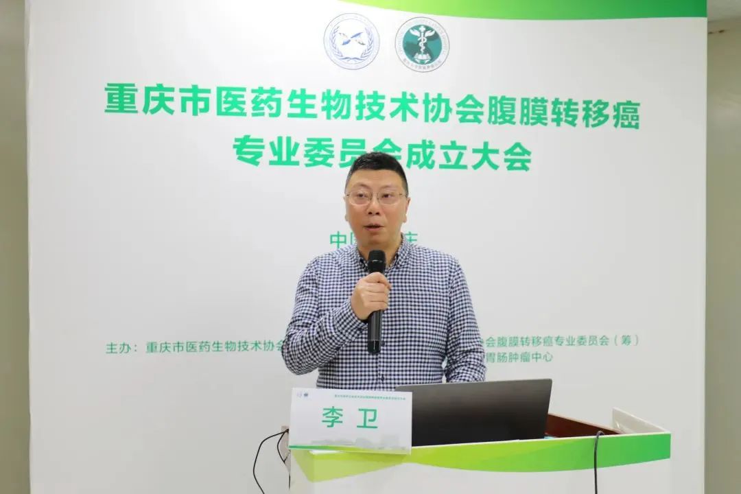 重庆市医药生物技术协会秘书长郑晓东致辞,他简要介绍了协会建设的背景和历史,以及发展定位和业务范围,并肯定了成立腹膜转移癌专业委员会的意义,表示专委会的成立对于协会工作将是一大补充,期待专委会在李卫主任委员的带领下,积极在技术服务、技术推广等方面开展工作。