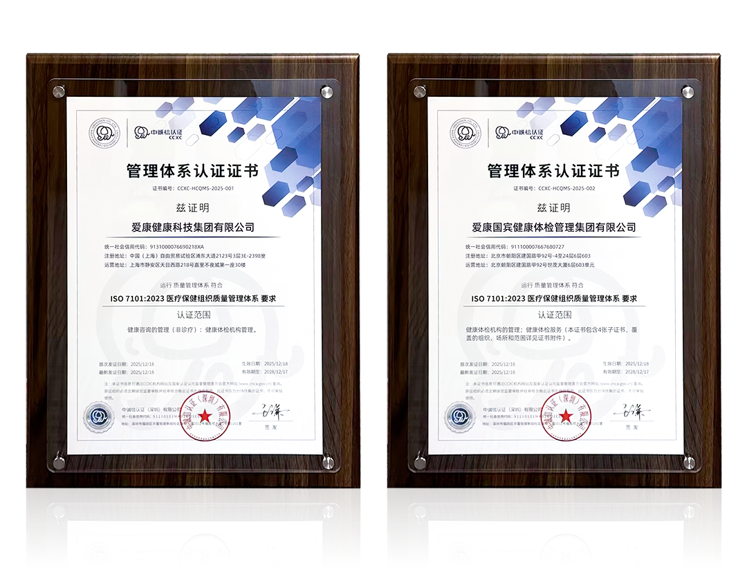 2025年12月,爱康集团(爱康健康科技集团、爱康国宾健康体检管理集团)及所属4家体检中心(北京爱康国宾中关门诊部、上海爱康国宾福康门诊部、成都高新爱康国宾城南体检门诊部、广州爱康国宾健康检查有限公司)通过国际标准化组织(ISO)颁发的ISO7101医疗保健组织质量管理体系认证,成为国内首家通过此标准认证的专业体检机构。