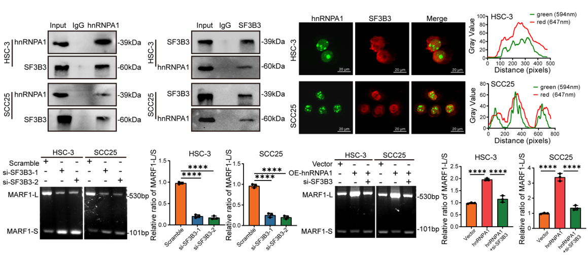 图3. hnRNPA1SF3B3相互作用调控口腔鳞癌中MARF1的可变剪接