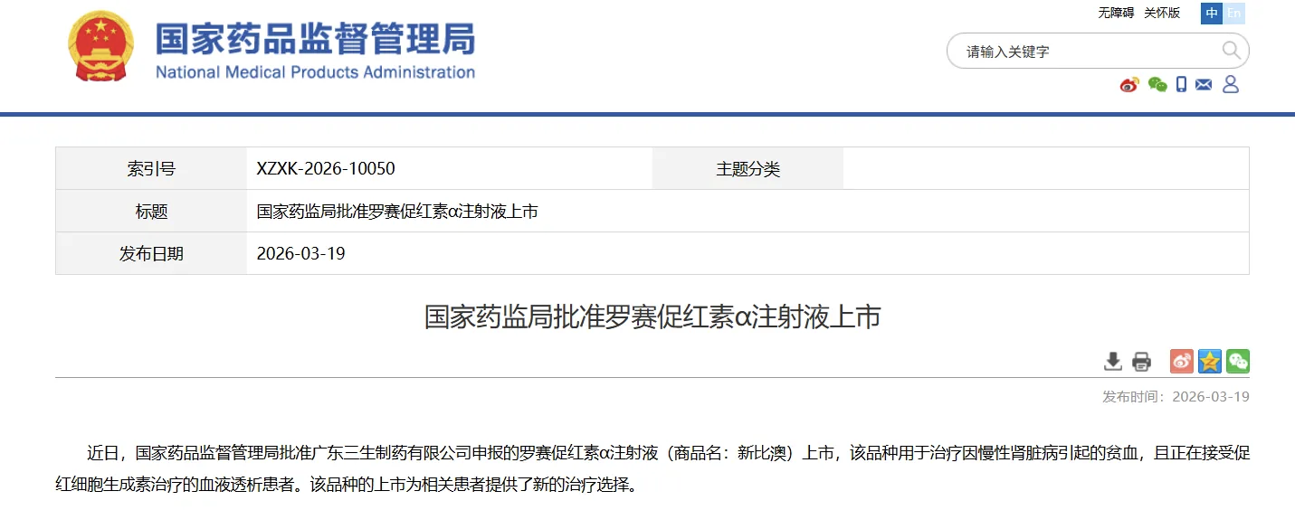 2026 年3月19日,中国国家药品监督管理局(NMPA)批准三生制药(01530.HK)1 类生物创新药罗赛促红素α注射液(新比澳)上市,批准适应症为:治疗因慢性肾脏病引起的贫血且正在接受促红细胞生成素治疗的血液透析患者。这是公司在肾科治疗领域的又一重要进展,为广大患者带来更多的选择和获益。