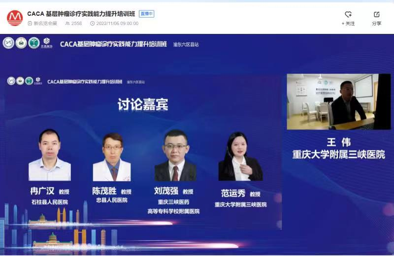 11月6日,由中国抗癌协会主办,重庆市医药生物技术协会、重庆抗癌协会、重庆大学附属肿瘤医院承办,中国抗癌协会(CACA)基层肿瘤诊疗实践能力提升培训会(渝东片区)通过线上的形式举行,来自三峡中心医院、梁平区人民医院、忠州区人民医院、云阳县人民医院、开州区人民医院和石柱县人民医院的相关专家参加本次线上培训。