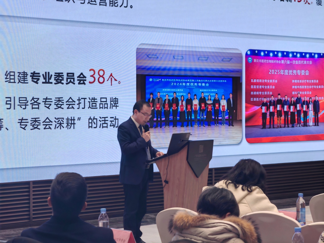他指出,协会通过设立监事会、细化内部机构、规范民主程序,持续优化治理结构;通过吸纳会员、加强培训、组建专业委员会,不断夯实人才支撑;通过全面启用钉钉办公平台和会员管理系统,推动管理与服务流程数字化、线上化。通过学术会议、科普活动所获反馈,实际印证扎实的组织建设对提升活动质量与效能的根本作用。他表示,协会将坚持“四个服务”宗旨,持续深化组织建设成果,探索多元交流模式,为推动重庆市医药生物技术领域创新发展贡献更大力量,也期待与各兄弟学会加强联动,共同搭建资源共享、优势互补协作平台,携手开创协会工作新局面。