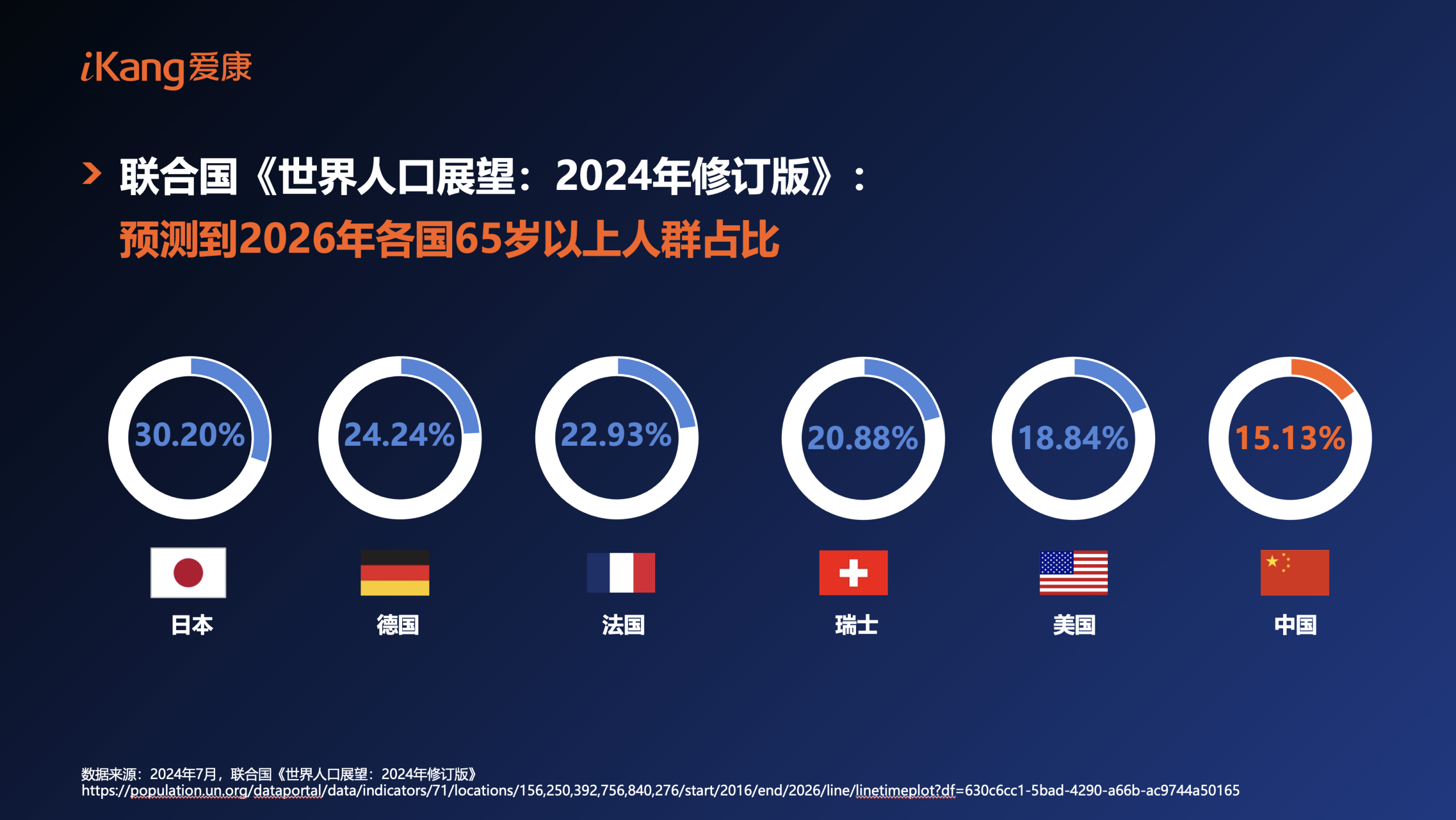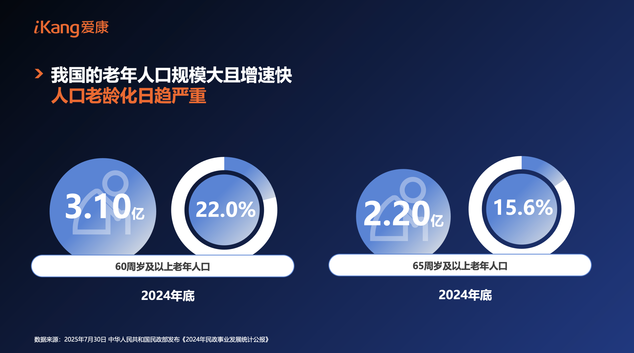 预计到2050年,全球65岁以上人口占比将提升至1/6。根据我国民政部最新数据显示,截至2024年底,我国60周岁及以上老年人口已达3.10亿,占比22.0%65周岁及以上老年人口2.20亿,占比15.6%,呈现规模大、增速快的深度老龄化特征。