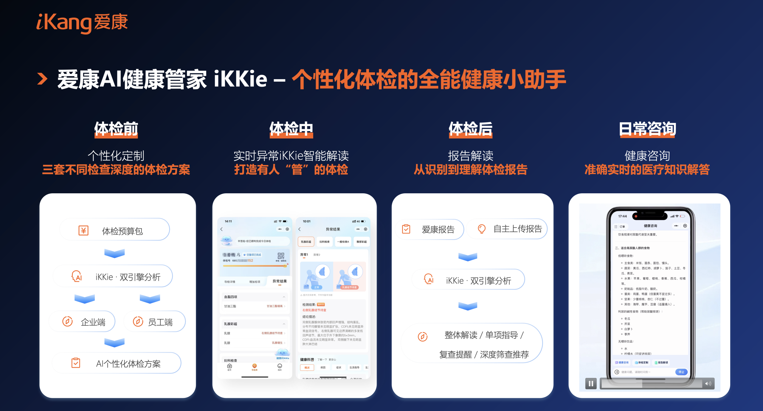 同时,爱康在2023年推出的首个AI健康管家——iKKie,其服务已覆盖检前定制、检中辅助、检后管理全链路。依托强医学规则+AI大模型双引擎驱动,iKKie能根据用户历史体检数据、家族病史、生活方式等信息,定制标准版、升级版、加强版个性化体检套餐,实现千人千检的精准健康管理。